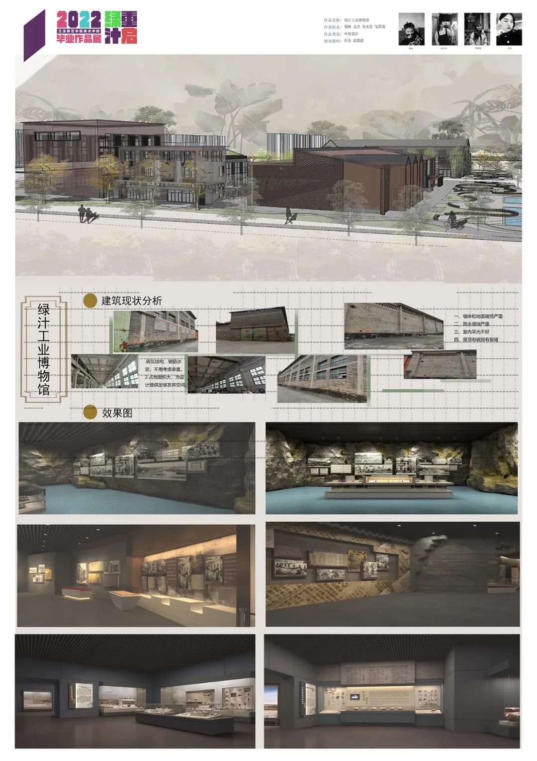 返校后,环境设计和视觉传达设计两个专业联合教学,打破专业壁垒;将综合设计和毕业设计课程合并,打通课程模块;教师带领学生,将绿汁镇复兴过程中存在的设计问题和发展需求转化为毕业设计项目,创新教学模式。至2022年6月,两个专业师生共完成设计方案24套,与美术学院其他专业毕业作品同期展出。