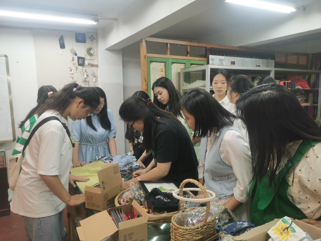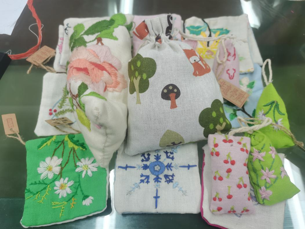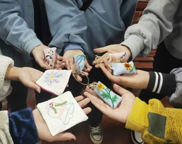 社团为同学们准备了布料、彩绳、针线、挂饰配件等材料。老师指导同学们在香囊上绣出了各自喜欢的图案。之后,社团向大家分配薰衣草香囊材料包,由老师带领同学们进行香囊的填充和缝合。当成果展现出来时,大家欣喜之情溢于言表,小小的香囊看起来美丽,做起来却不简单。在制作过程中,同学们一边缝香囊,一边讨论交流缝制心得,一片欢声笑语。不知不觉中,一个个形态各异、色彩斑斓的香囊堆满了桌子,同学们收获满满。