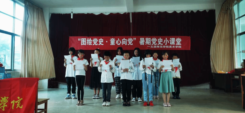 成果展示 见证成长:7月30日下午,实践团成员和村民以及孩子们对五天的实践成果进行了总结和展示。孩子们带着自己的作品,和大家分享了学习体会。队员们朗诵了红色诗集,讲述了红色故事 ,他们表示,与孩子们相处的快乐时光,是他们最大的收获。社区工作人员及家长表示本次社会实践活动内容丰富,形式多样,将党史故事用喜闻乐见的方式融入艺术教育实践中,孩子喜欢,宣传效果好。