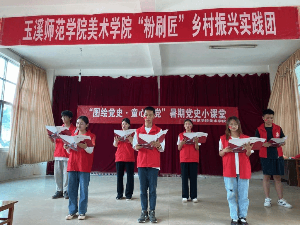 团队成员在辅导员杨明秋、杨娟两位老师的带领下,紧密结合党史学习教育和乡村振兴,充分发挥美术专业特长,组织开展“党史故事进乡村”“粉刷匠”“童心向党”等系列主题活动,弘扬党史文化,传承红色基因。灵秀社区100多名少年儿童参加到美术、书法、手工、墙绘、讲故事等活动。