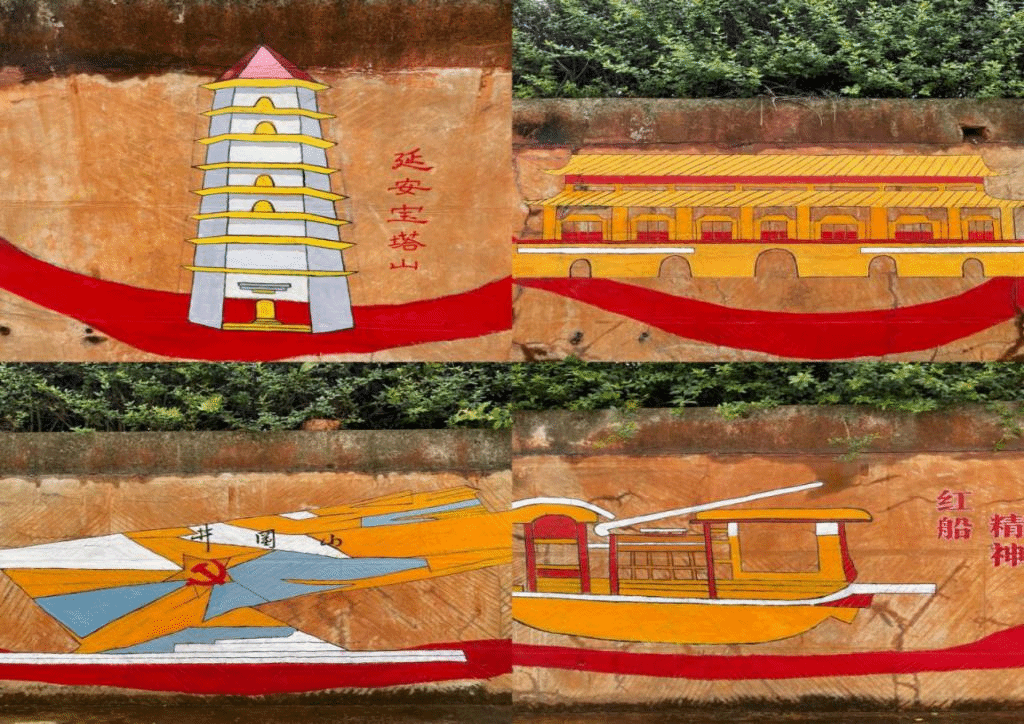 助力乡村振兴 绘就美好蓝图:实践团经过认真调研,以“讲好红色故事 传承红色基因”为主题,发挥美术专业优势与特色,设计并绘制了约27米红色文化墙,潜移默化进行红色文化教育。七月酷暑,队员们头顶烈日,经过五天的精心创作,“嘉兴红船”“延安宝塔山”“革命根据地井冈山”等作品精彩呈现。墙绘得到了村民的高度认可,也为灵秀村的文化建设增添了绚丽的一笔。