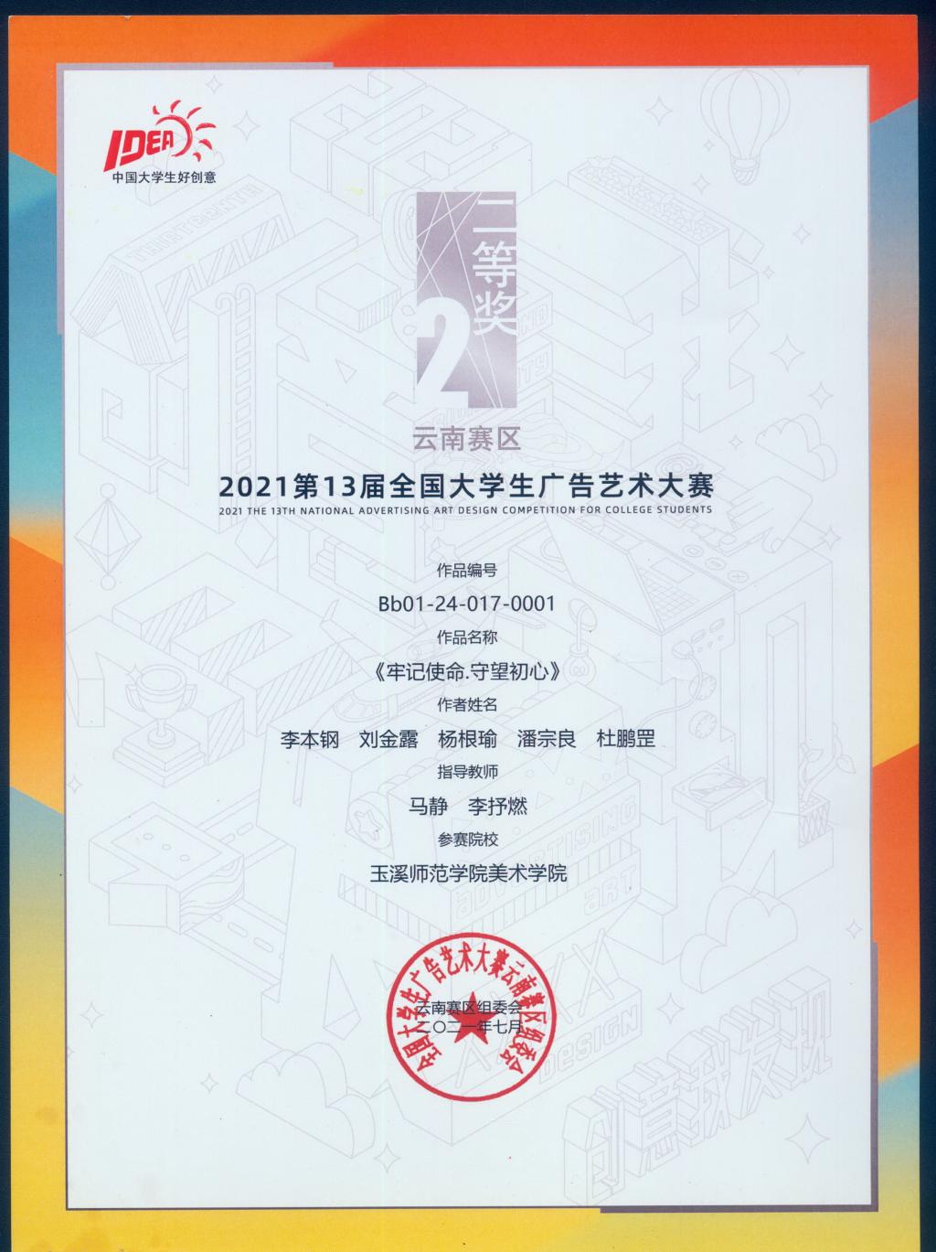 由美术学院马静、李抒燃老师指导,18级数字媒体艺术专业李本钢、刘金露、杨根瑜、潘宗良、杜鹏罡同学的微电影作品《牢记使命,守望初心》获得云南赛区二等奖。