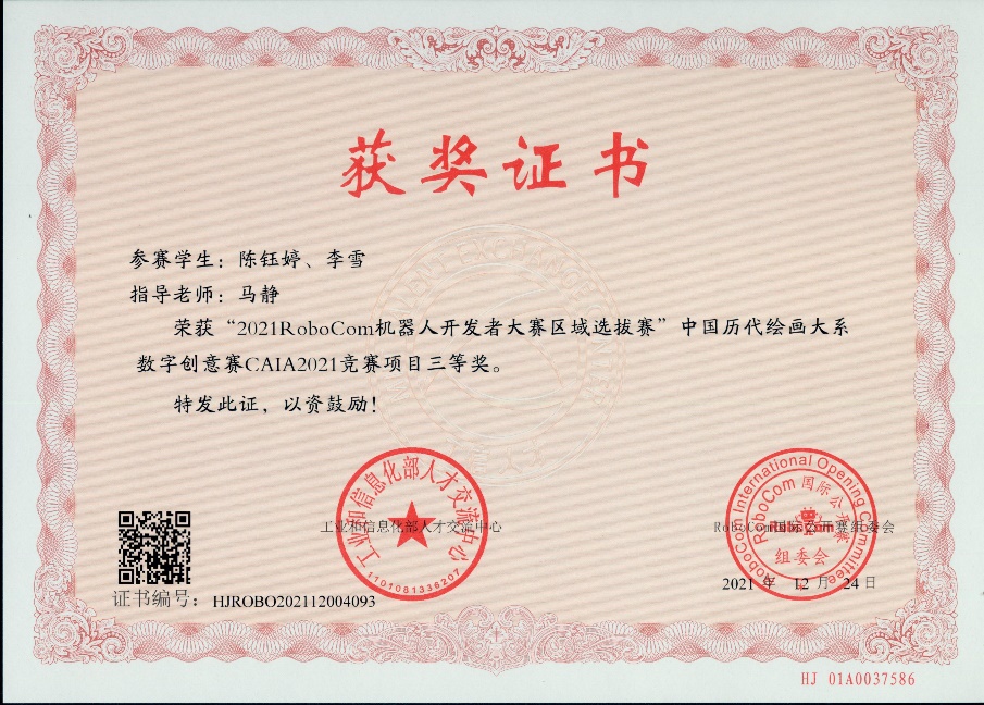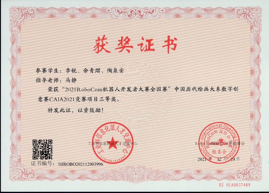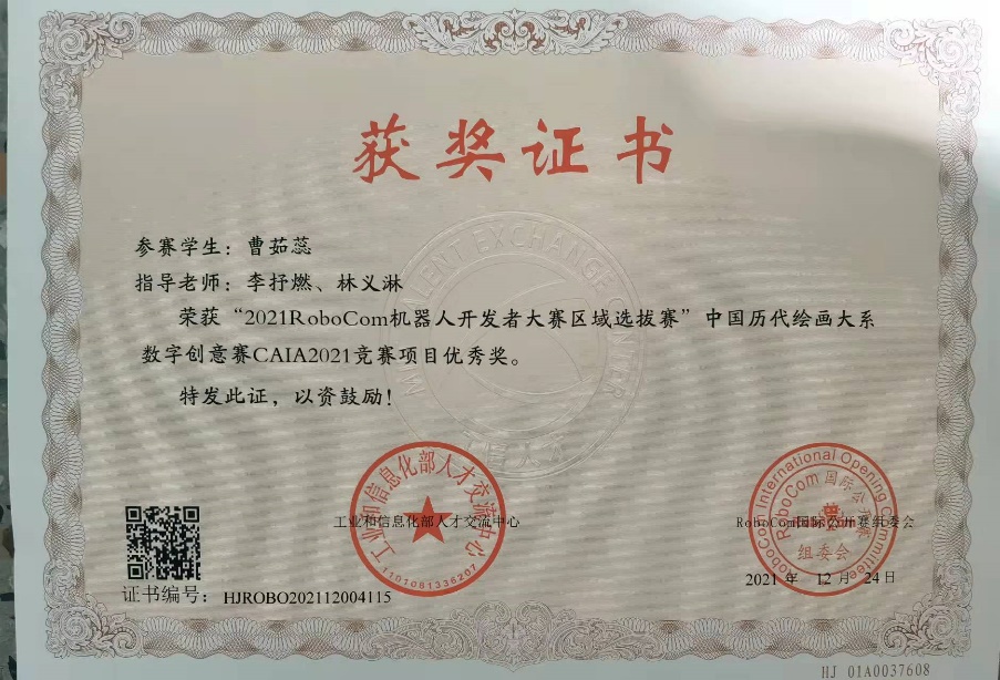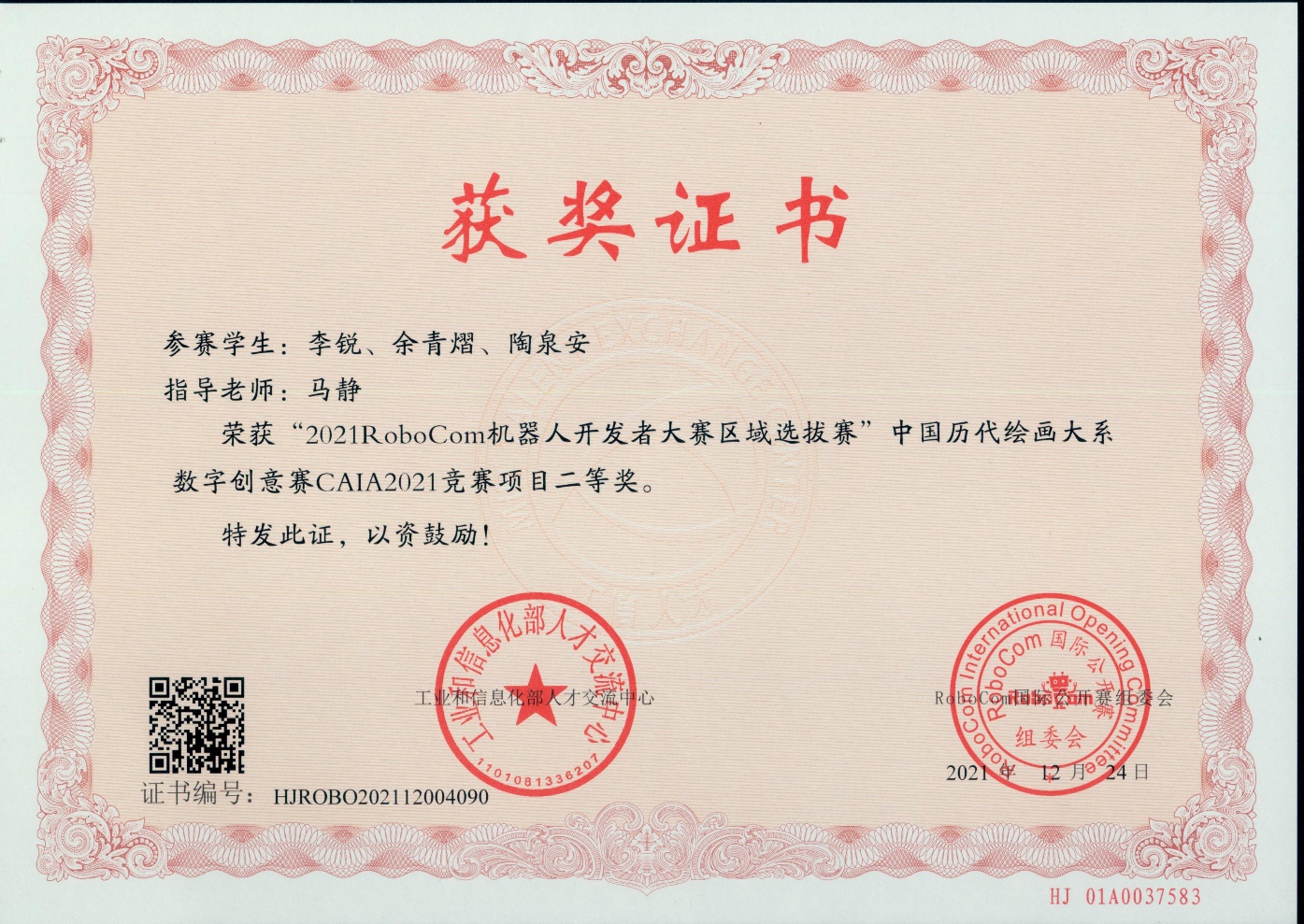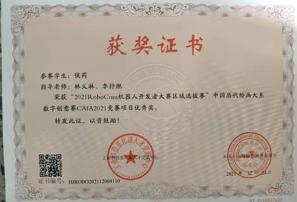 “RoboCom机器人开发者大赛”是教育部认可的大学生学科竞赛,中国历代绘画大系数字创意赛(CAIA2021)作为本赛季的特色赛道之一,代表了“大系”项目在传承中国传统文化方面的优秀成果。赛事从2021年6月启动征集作品、区域赛选拔到决赛,参赛选手们将艺术与科技充分地结合起来,创作出了精彩纷呈的影像和交互设计作品,开创了数字技术重新表现中国传统艺术的新途径。