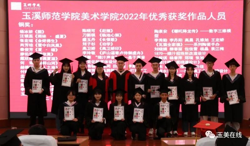 赵芳副院长宣读优秀毕业作品奖项,杨轶然老师宣读优秀毕业生、优秀党员等奖项并由各学院教师为获奖同学颁发奖项并合影留念。本典礼共颁发优秀毕业作品金奖11个,银奖18个,铜奖21个,优秀毕业生省级13人,校级27人,院级15人、优秀党员8人。