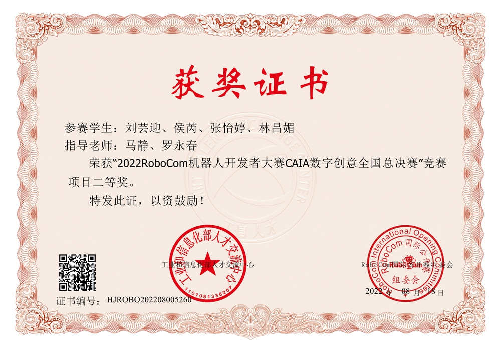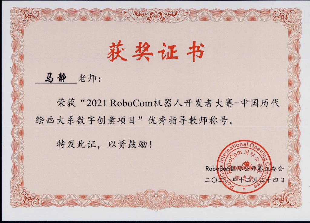 我校美术学院数字媒体艺术专业在“2022RoboCom机器人开发者大赛CAIA数字创意全国总决赛”中,获全国总决赛一等奖1项,二等奖2项;获云南省赛一等奖3项,优秀奖1项;马静老师荣获优秀指导教师的荣誉。