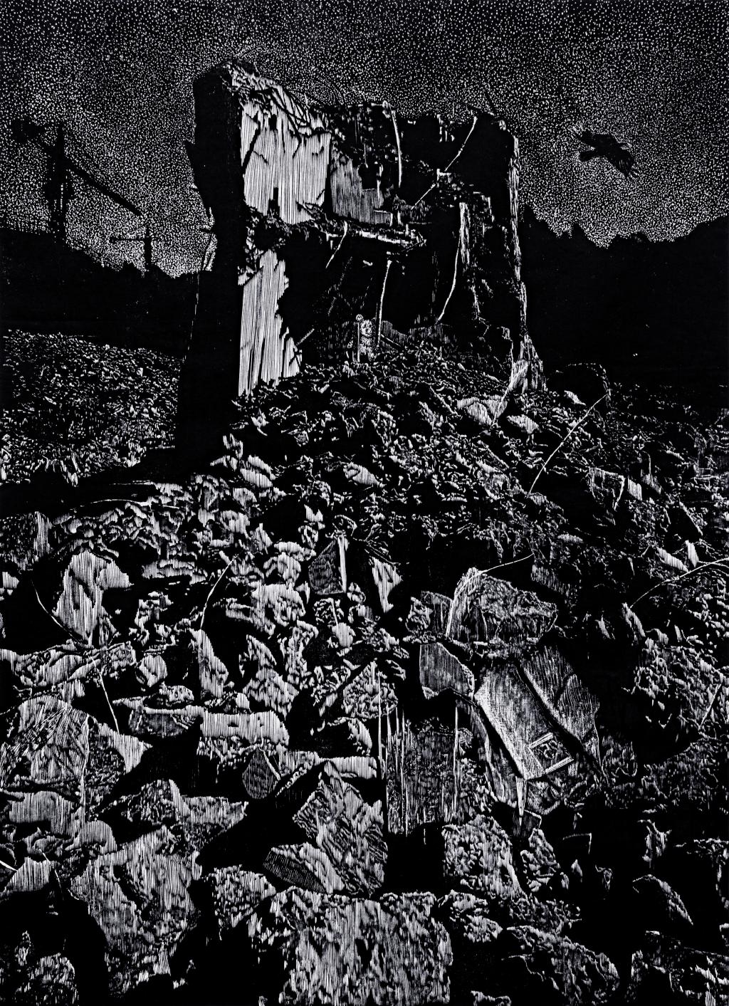 《异地搬迁一一崖头村纪实》 李吉 92cm X140cm 黑白木刻