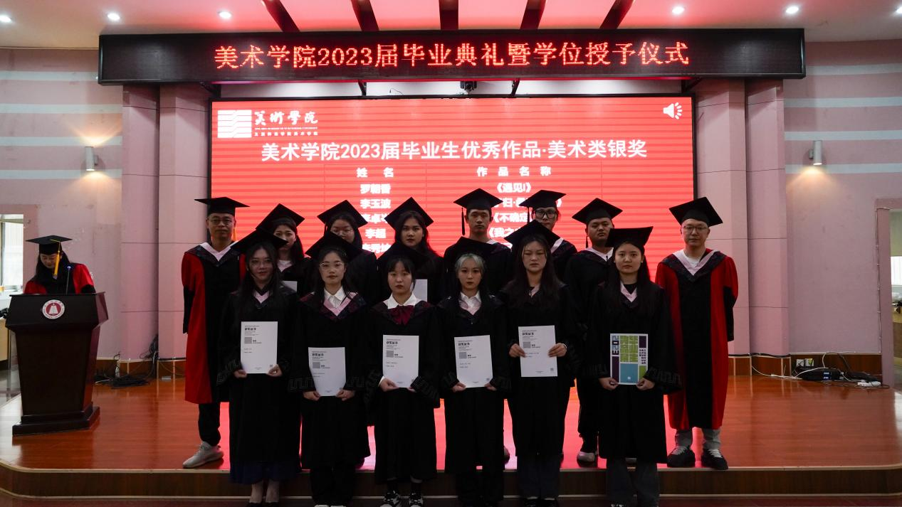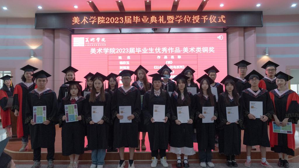 美术学院禾子佳老师、梁木老师、熊斌老师为2023届优秀毕业作品铜奖(美术类)获得者颁奖并合影留念