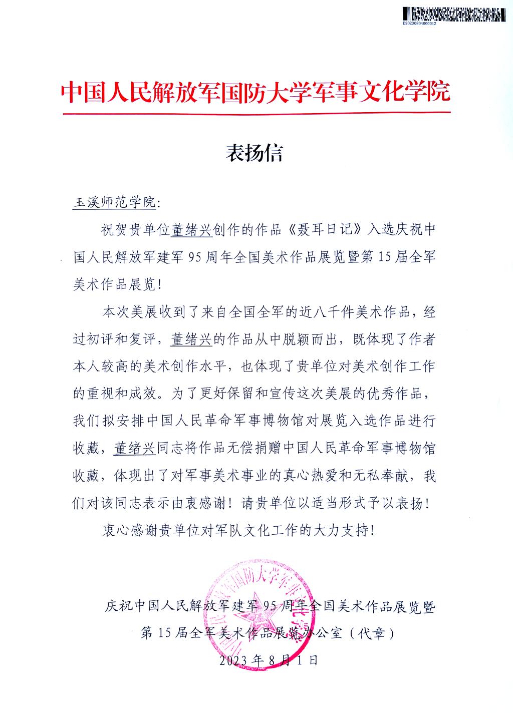 美术学院雕塑专业教师董绪兴老师将作品无偿捐献给中国人民革命军事博物馆收藏,得到了主办方的高度赞扬。近日,专门发来的表扬信,对董绪兴老师的作品给予了肯定,对他所体现的对军事美术事业的真心热爱和无私奉献,表示了由衷的感谢!同时,衷心感谢学校对军队文化工作的大力支持!