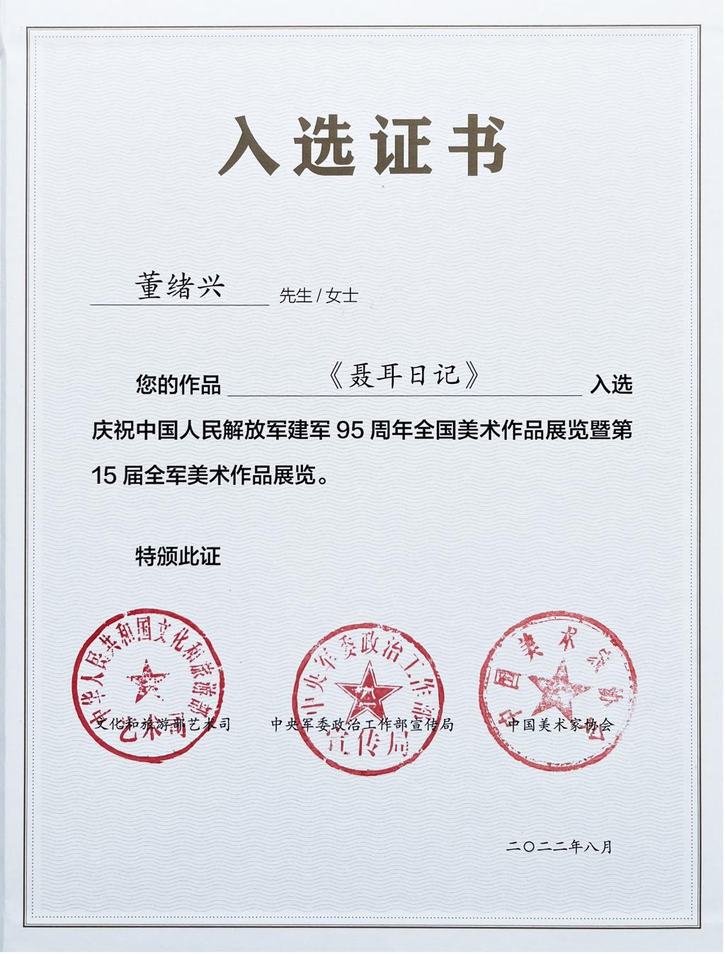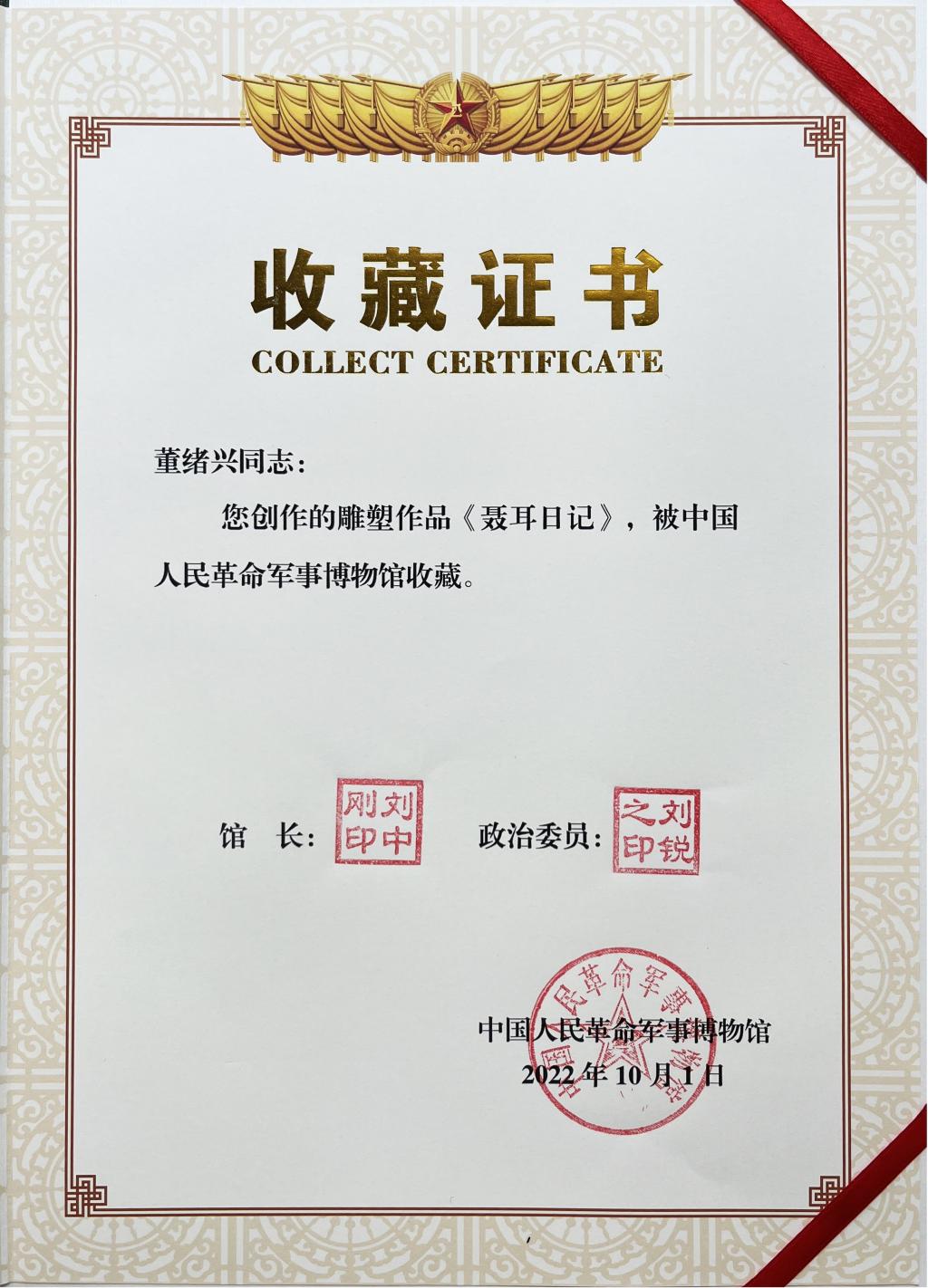 雕塑作品《聂耳日记》2022年8月入选“庆祝中国人民解放军建军95周年全国美术作品展览暨第15届全军美术作品展”,2022年10被中国人民革命军事博物馆收藏,该作品从来自全国全军近八千件美术作品中脱颖而出,体现了创作者较高的美术创作水平,也体现了玉溪师范学院对青年教师科研创作能力的重视与成效。