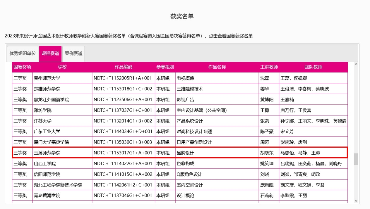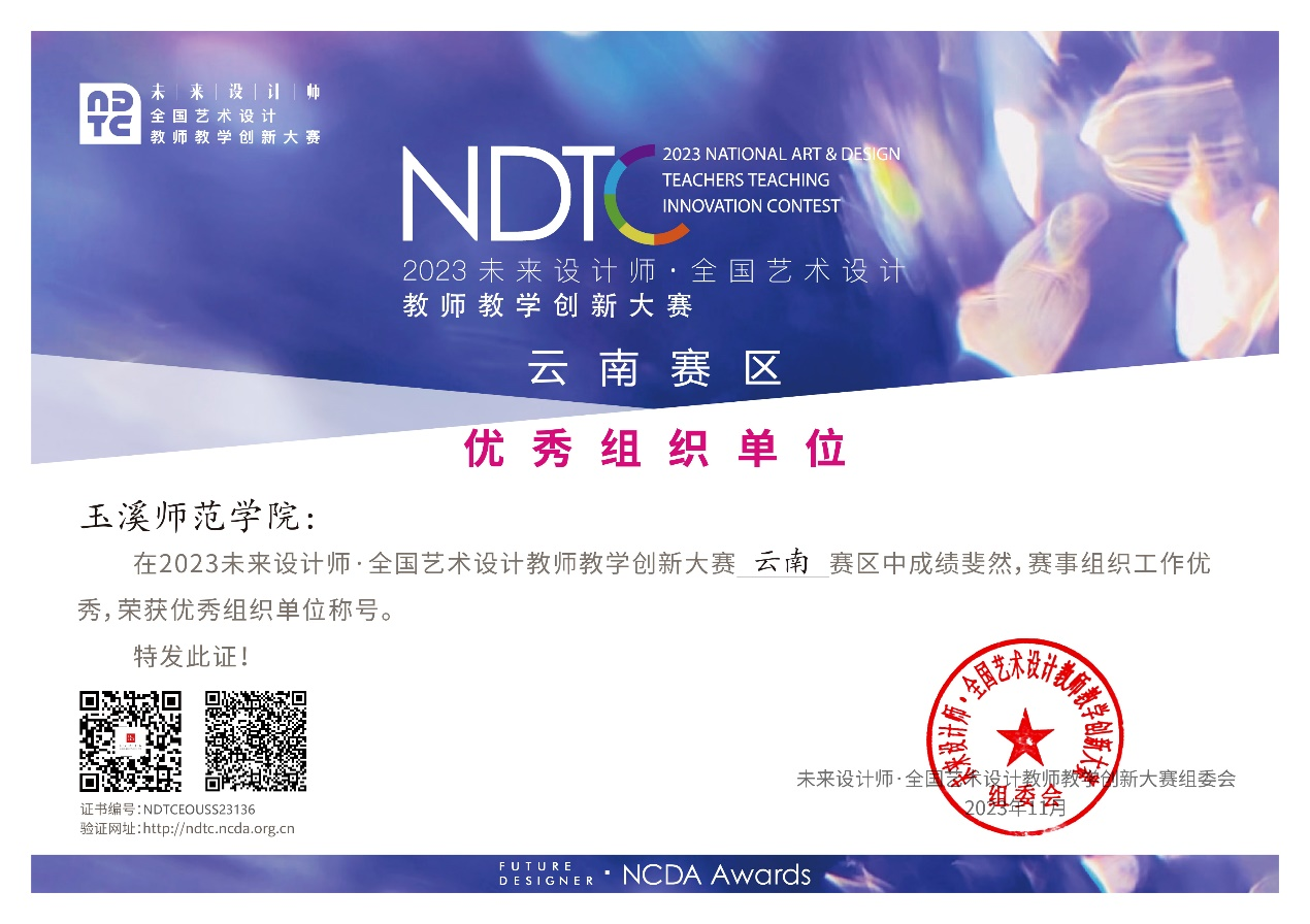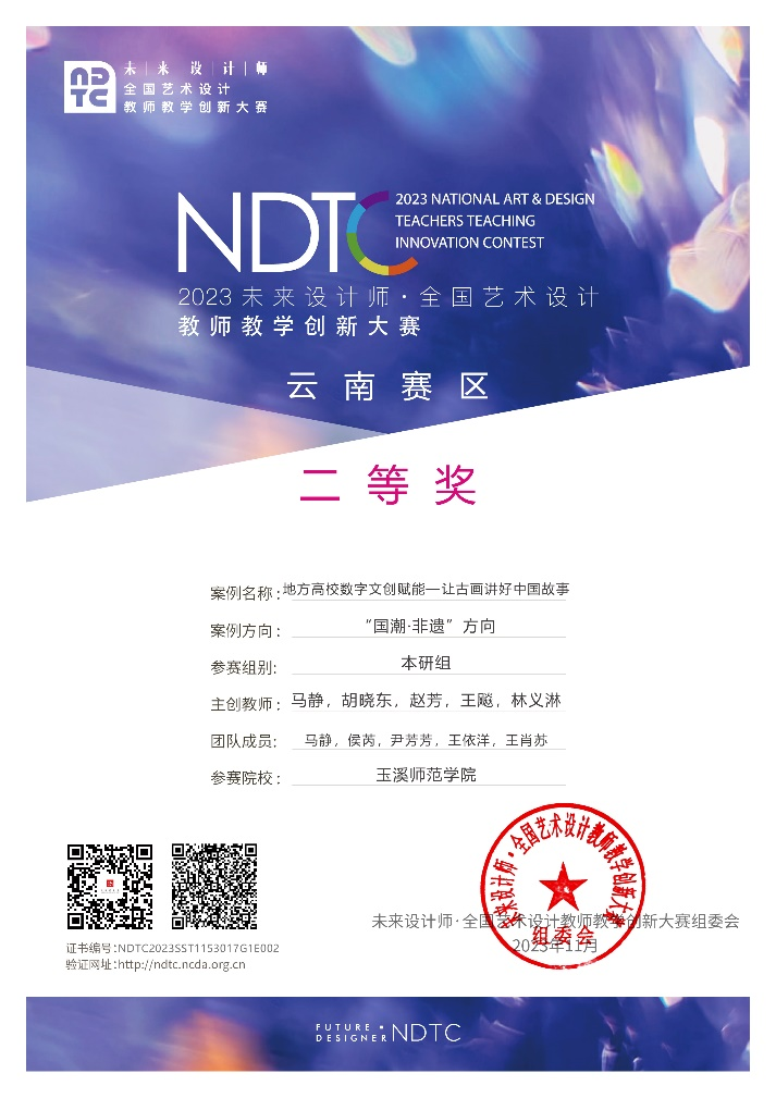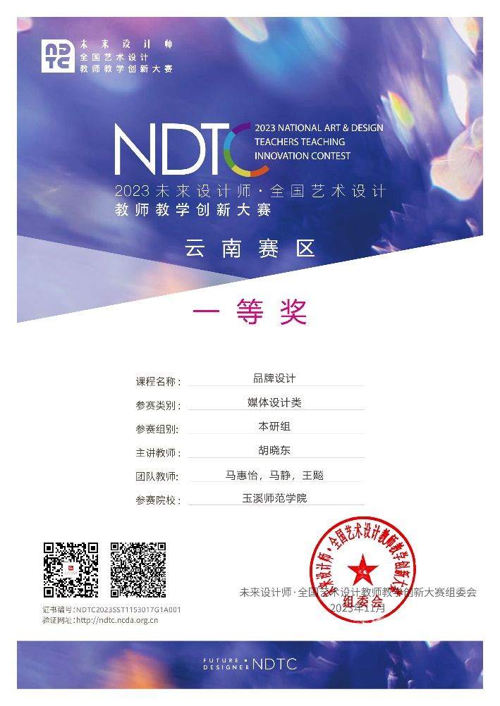 2023年未来设计师·全国艺术设计教师教学创新大赛全国总决赛圆满落幕,玉溪师范学院荣获云南赛区优秀组织单位荣誉,美术学院胡晓东、马静、马惠怡、王飚老师的《品牌设计》课程荣获全国总决赛三等奖,云南省赛一等奖;马静、胡晓东、赵芳、王飚老师的课程案例《地方高校数字文创赋能—让古画讲好中国故事》荣获省赛二等奖。