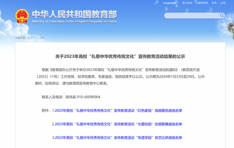 2023年高校“礼敬中华优秀传统文化”宣传教育活动由教育部思想政治工作司主办,主题为“根植文化沃土 汇聚奋进力量”,分为四类项目,其中“水墨校园”绘画联播共遴选100件作品,目的是组织干部师生深入发掘校园文化中蕴含的中华优秀传统文化因素,以中国传统绘画形式描绘校园人物、景物和事物,在创作中体会传统水墨乐趣,在宣传展示中感受传统文化的魅力,在传统文化滋养中坚定文化自信,引导师生自觉传承中华优秀传统文化,积极营造具有中国传统文化底蕴的校园文化氛围。