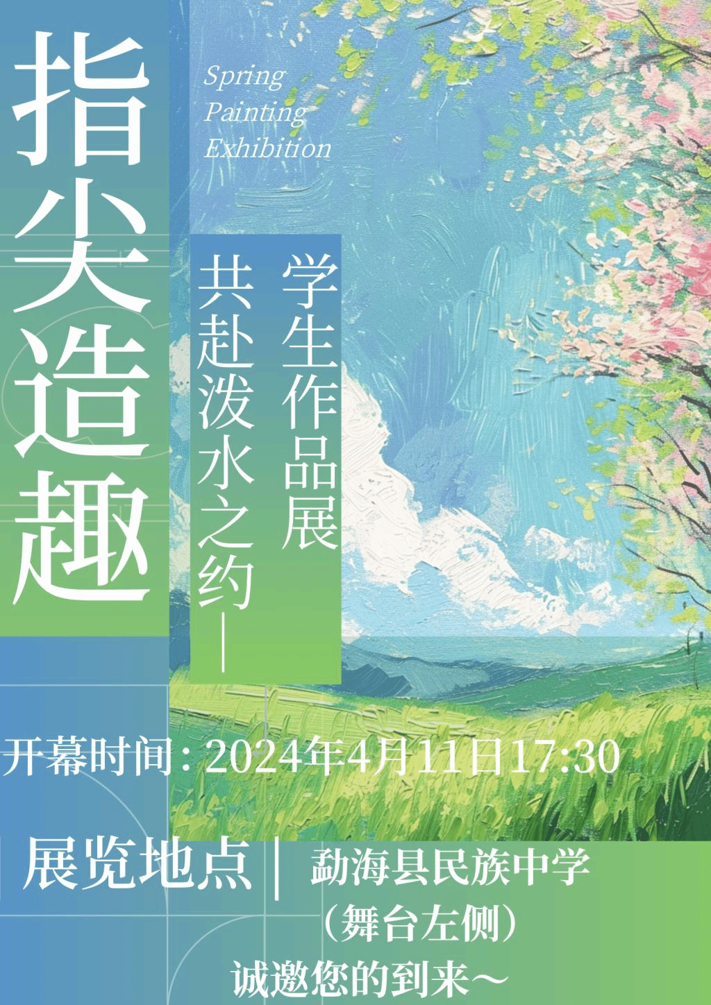 展览开幕式于2024年4月11日在勐海县民族中学隆重举行。勐海县教体局副局长余仕春、陈娟、白照裕,勐海县民族中学、第一小学、布朗山九年一贯制学校等校领导,以及我校派驻勐海的师生、参展学生参加了开展仪式。与会领导表示,展览不仅是一次艺术的盛会,更是一次文化的交流,一次美育教育的实践。