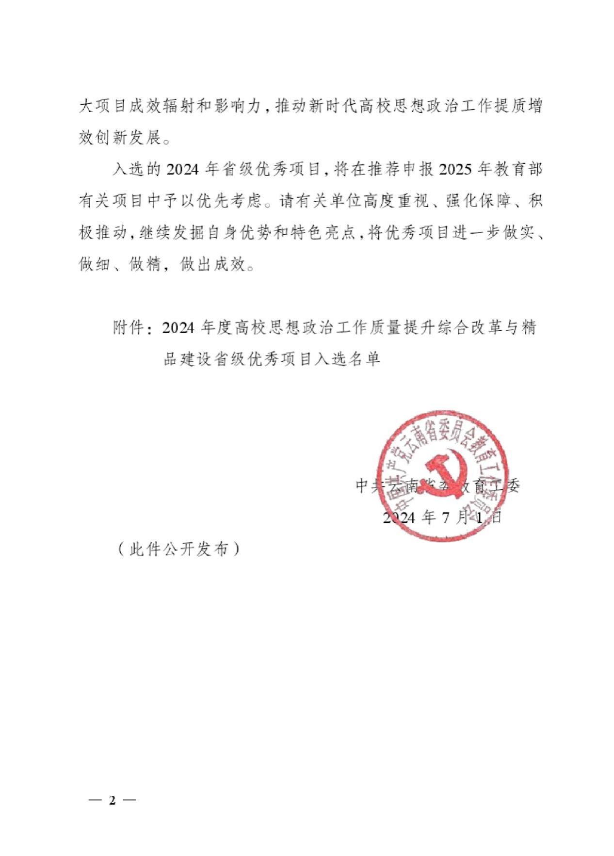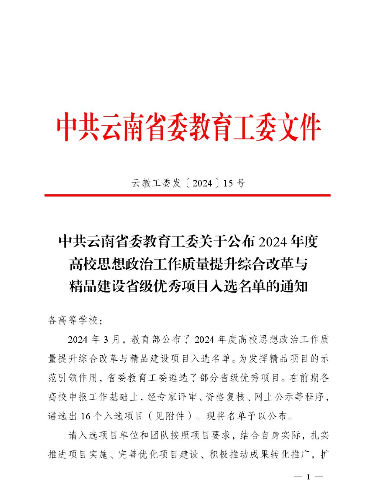 据悉,教育部公布了2024年度高校思想政治工作质量提升综合改革与精品建设项目入选名单,云南5类共8个项目成功入选。为发挥精品项目的示范引领作用,省委教育工委遴选了部分省级优秀项目。在前期各高校申报工作基础上,经专家评审、资格复核、网上公示等程序遴选出16个入选项目。