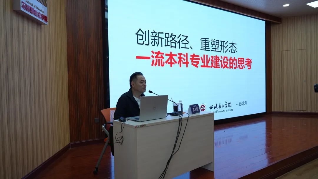 研讨会当日下午,在学校马克思主义学院报告厅举办了两场交流讲座。四川美术学院教务处处长苏永刚教授以《创新路径、重塑形态、一流专业建设的思考》为题,从人工智能冲击艺术与设计的固有领域展开对一流专业建设的解读与思考,细化分析了专业、课程、教师、教材、质量五个人才培育的基本要素,指导美术学院教师探讨学科与专业建设的创新路径。