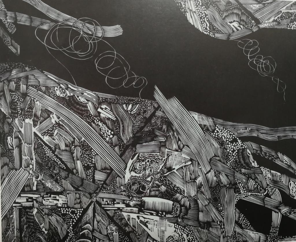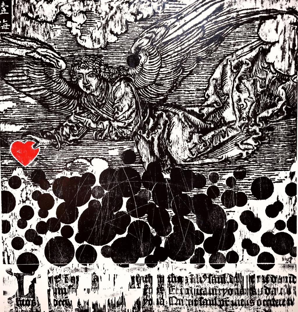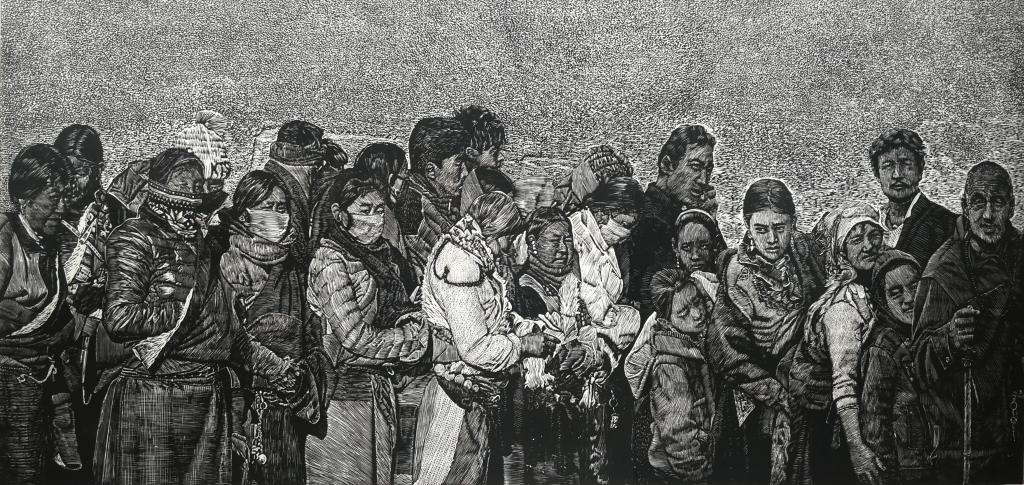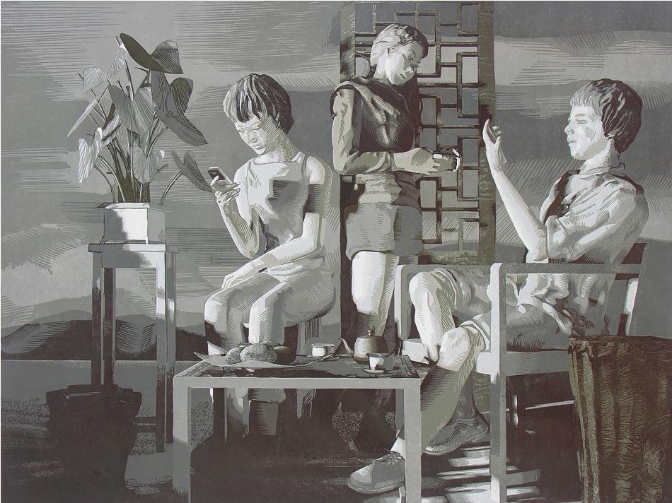 《聚在一起聊天的人们》李宏斌,65X86.7cm ,木板油印