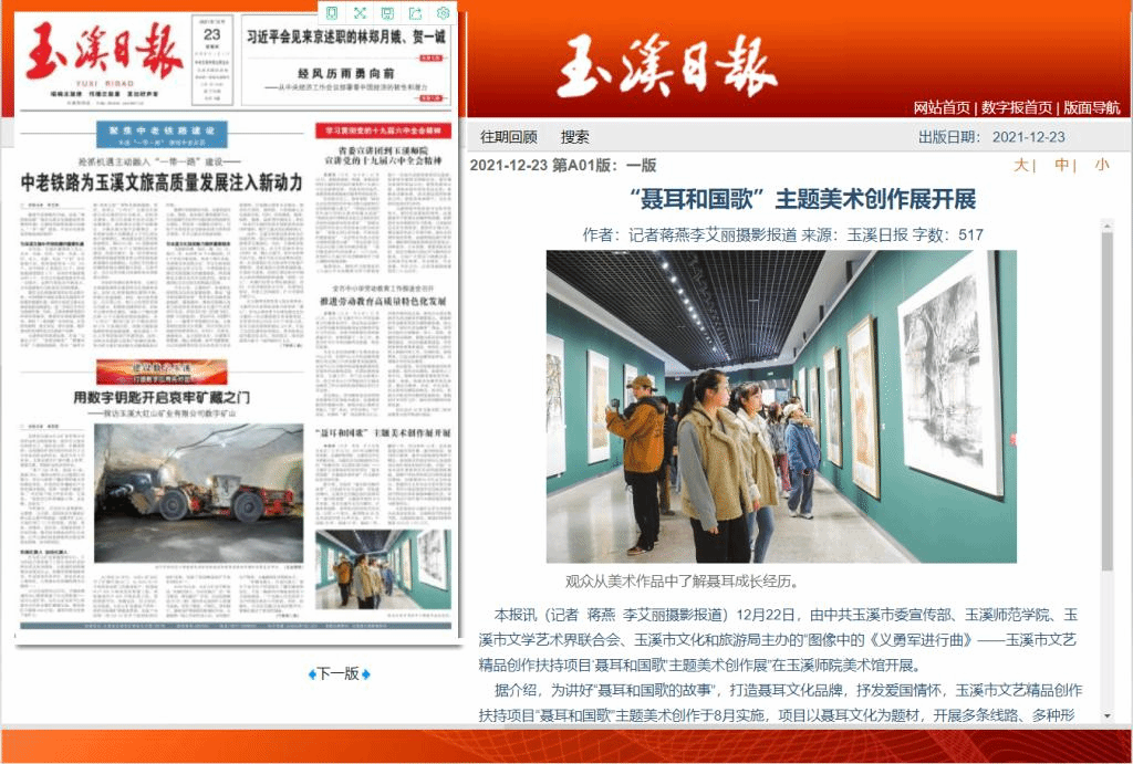 本报讯(记者 蒋燕 李艾丽摄影报道)12月22日,由中共玉溪市委宣传部、玉溪师范学院、玉溪市文学艺术界联合会、玉溪市文化和旅游局主办的“图像中的《义勇军进行曲》——玉溪市文艺精品创作扶持项目‘聂耳和国歌’主题美术创作展”在玉溪师院美术馆开展。
