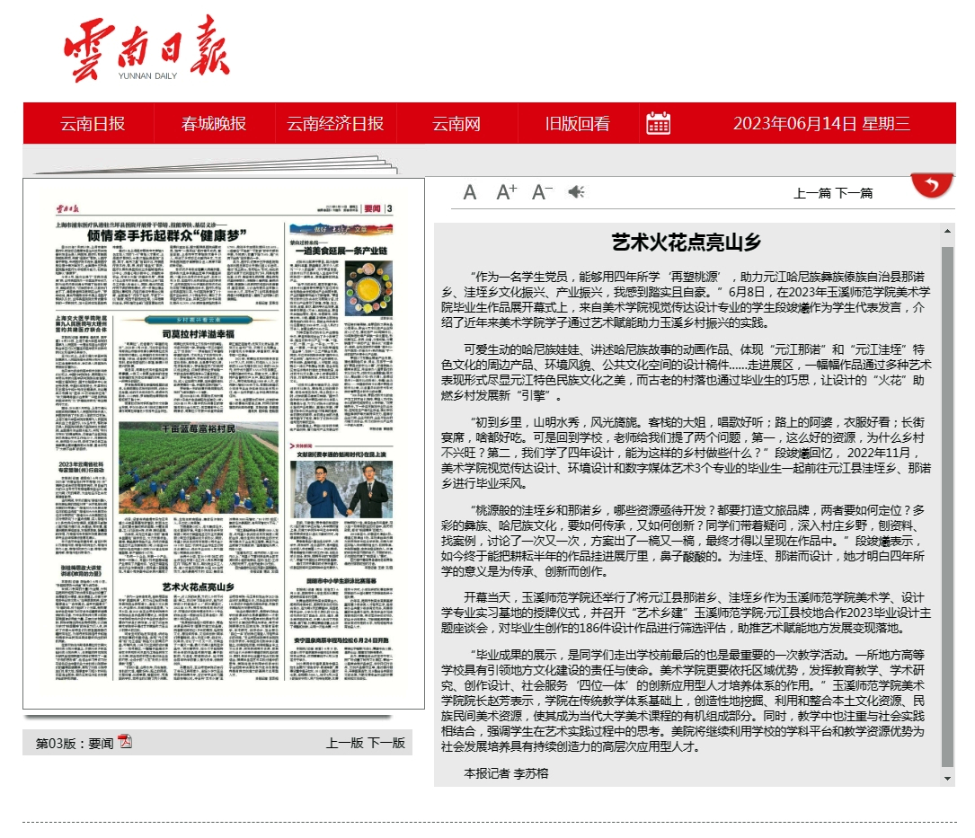“作为一名学生党员,能够用四年所学‘再塑桃源’,助力元江哈尼族彝族傣族自治县那诺乡、洼垤乡文化振兴、产业振兴,我感到踏实且自豪。”6月8日,在2023年玉溪师范学院美术学院毕业生作品展开幕式上,来自美术学院视觉传达设计专业的学生段竣爔作为学生代表发言,介绍了近年来美术学院学子通过艺术赋能助力玉溪乡村振兴的实践。