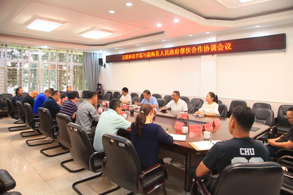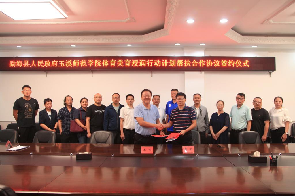 为认真贯彻落实云南省教育发展大会精神和省委办公厅、省政府办公厅相关文件精神,9月15日,勐海县副县长王东、教育体育局局长洪伟一行4人到玉溪师范学院座谈交流,并与我校签署体育美育浸润行动计划帮扶合作协议。玉溪师范学院副校长章新,教务处、人事处、体育学院、美术学院、音乐学院领导,浸润行动计划驻点教师参加座谈会。