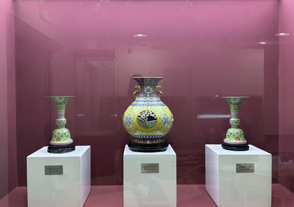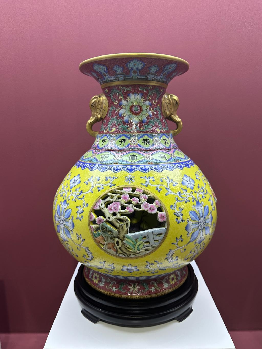 仿清乾隆珐琅彩米色地描金缠枝花纹瓶 仿清粉彩扒花黄地缠枝花纹将军罐 仿清乾隆金地花卉镂空婴戏纹四耳转心盖瓶