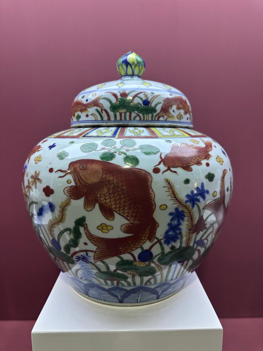 仿明嘉靖五彩鱼藻纹盖罐
