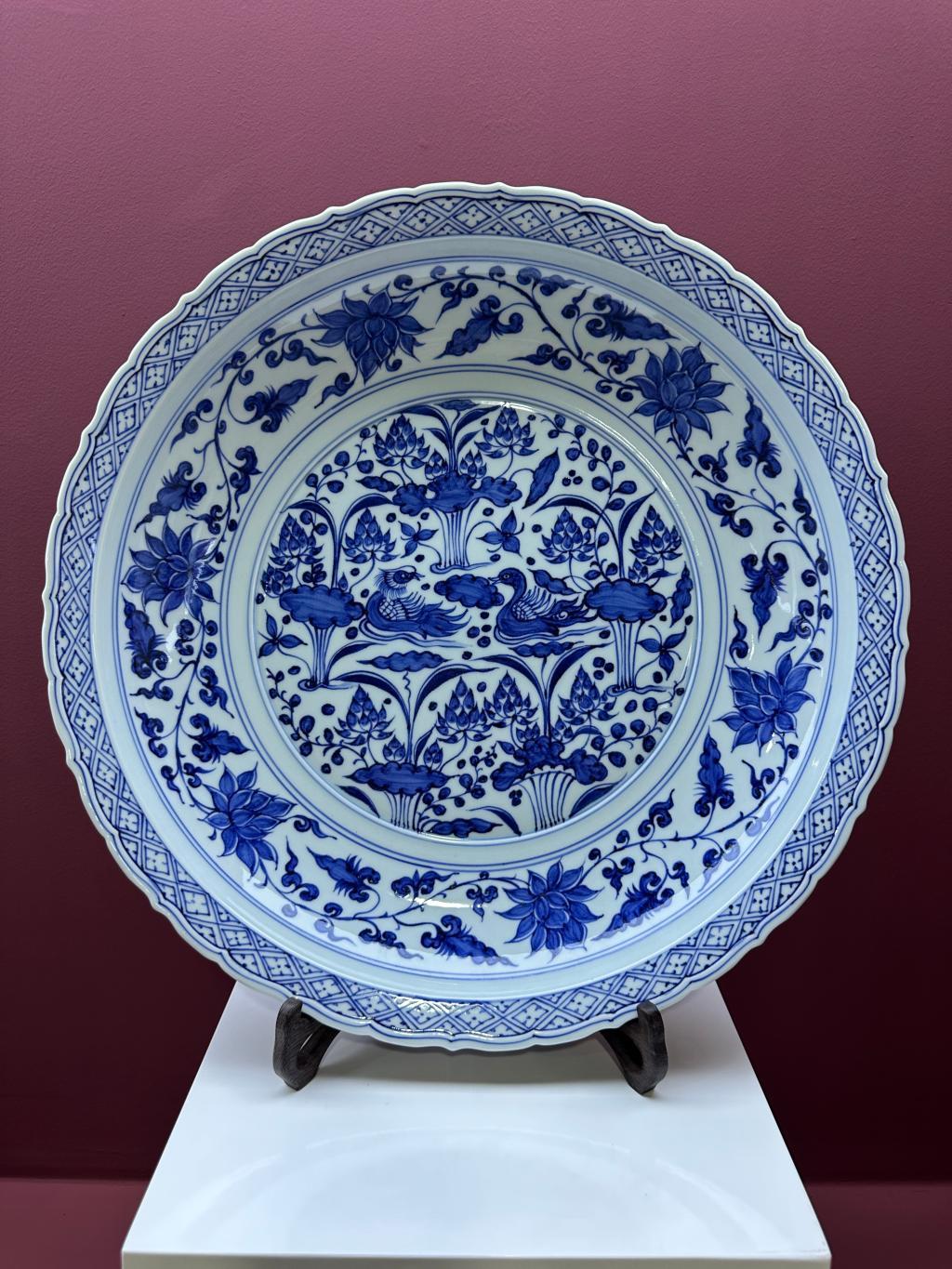 仿元青花鸳鸯莲池纹菱口盘