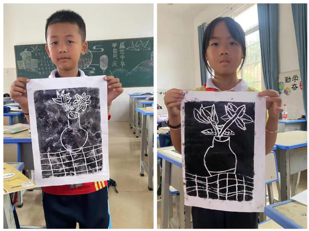 户外写生后,我还上了一堂有趣的吹塑纸版画课。那天我走进教室拿出准备好的特殊教具,孩子们都瞪大了眼睛好奇地问:“老师,这是什么呀”?“老师今天要教大家一种独特的绘画技巧,通过印制得到美丽的图画。”我开心地说。课堂上,我展示印好的作品,向学生们介绍用吹塑纸制作版画的方法。孩子们激动不已,迫不及待地加入进来,尽情发挥,印出一件件有趣的作品来。课后孩子们还围着我问,下学期还可不可以再上这样的课。以心向美,以美润心,一瞬间我体验到了做老师的那份发自心底的快乐,也体会到作为教育者的责任和使命。